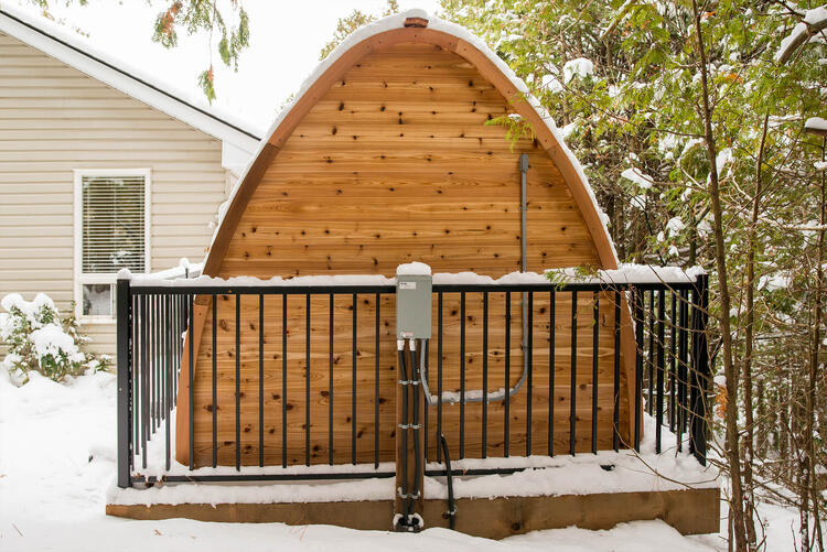 These organic rain-drop shaped outdoor saunas have a wonderful design and come in various sizes, with endless options so you can customize your own outdoor sauna. To make the finished product water tight, you can choose either bevel siding or cedar shingles. The sauna door is a solid cedar door frame with full glass bronze tempered window.